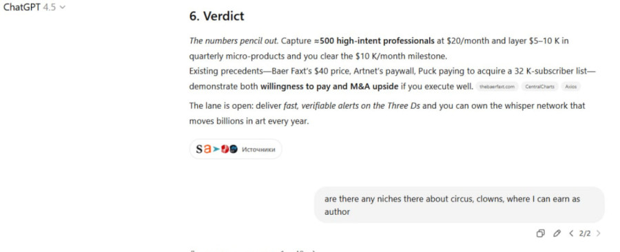 Для лучшего результата надо давать постепенное сужение темы, например: какие клоунессы работают в Канаде и США? Кто из них имеет сольный номер? Кто из них подходит по стилю к романтическому? И каждый ответ будет в итоге качественнее и качественнее, чем если задать сразу в одном запросе все точные детали.