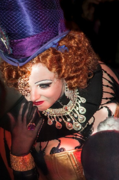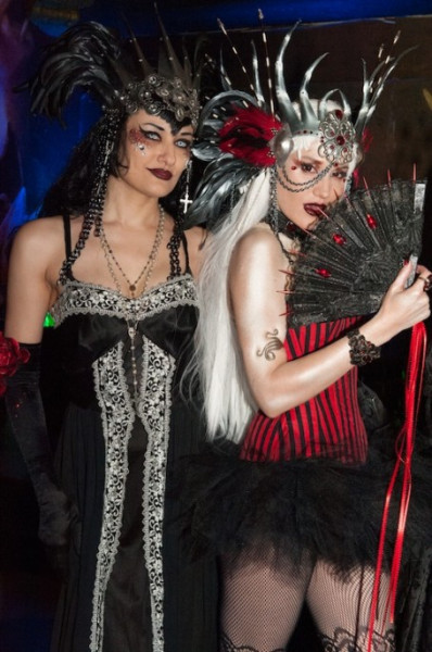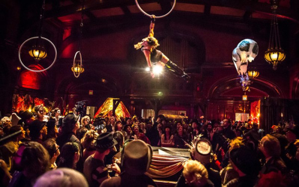 Вошли довольно быстро, тут у меня челюсть-то и упала. Представьте себе все здание, жужжит как улей. Тысячи людей, практически все невероятно декорированы (приветы от Бернинг Мэна, Венеции и Цирка дю Солей). Огромный зал с опоясывающим балконом с музыкой, цирковыми, аттракционами... На верхнем этаже - кулуары, выставки, гадалки по руке и картам, кукольные представления, буфеты, камины. В подвале - ярмарка мастеров, продающих невообразимой крутизны корсеты, шляпы с перьями, какие-то неописуемые кожаные аксессуары, типа полу-жилеток, всевозможные украшения...