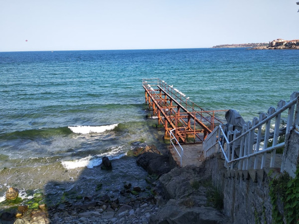 За последний месяц мы пережили волну жары до +36. Сейчас уже, к счастью, прекрасные +27 на ближайшую неделю, плюс ночи стали посвежее. А то был такой адище, что я пару недель назад в панике заозиралась, куда б свалить отсидется, где больше кислороду, сухости и тени. Это мужу моему нравится, когда сильно тепло, а мне тяжело. Я открыла свой любимый погодный сайт вентускай и обнаружила, что по всей Болгарии будет "жега", как они называют жесткую жарищу, +35+38, местами +42, и даже в горах днем ожидалось выше 30, хотя ночью +19. И вдруг! Вентускай шепотом поведал, что совсем в противоположном от гор направлении, южнее Варны и Бургаса, на остром мысу, торчащем в море, есть волшебное место Созополь, где всегда царят +27. Я решила разъяснить этот феномен, позвала с собой подружку, мы взяли на выходные номер в курортной гостинице под Созополем и помчались туда на машине, уповая на чудо. Ну что я могу сказать... Кто не рискует, тот не пьет шампанского. А у нас с собой было. Мы оказались в райских кущах на крутом берегу среди сосен, продуваемых сильным морским бризом. Сухо, тенисто, блаженная свежесть. Не знаю, сколько было на градуснике, но ощущения действительно на +27. Мы возликовали и отметили победу ужином в ресторане с видом на закат в море.
