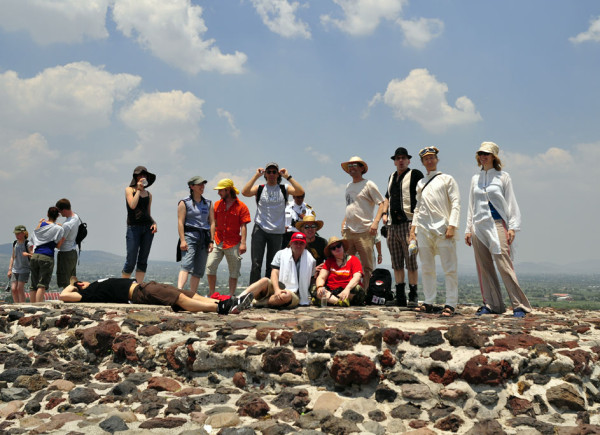 Потом час везли по окрестностям с горами, прериями и здоровенными кактусами: на круглых лепешках, громоздящихся высотой с дерево, сидят красные яблочки. Коля сорвал пару, оттер колючки и сожрал, причмокивая. Сладенькие, говорит. Перед пирамидами – харчевня, где показывают из чего делают текилу и афрозидиакскую (как хоть это пишется-то?) жидкость «пульке» (6 % алк.). Оказывается, из агавы, которая достигает тут размеров куста сирени. Мучачо в пончо продемонстрировал, как обломав кончик листа сразу получаешь скорняжную иглу с суровыми нитками. Внутренний слой листа можно легко снять и использовать как полупрозрачную бумагу или материал для презерватива, ниже слой – для мыла, из мякоти мнут закуску, из сока через сутки сама собой забраживается пульке, а из нее уже гонят текилу (38%). Последнюю, оказывается надо пить так: лизнув руку, насыпать соли, взять наизготовку кусок лимона и полную рюмку, по-испански громко хором сказать тост, махая рюмкой в нужном направлении: «За верх, за низ, за середку, за яйца, и – внутрь!» Потом слизать соль, зажевать мякоть лимона, смешать во рту со слюнями, побултыхать туда-сюда, и только теперь хлопнуть стопарик. Процесс непростой, требующий полного сосредоточения и сопереживания с собутыльниками. Напоив, нас завели в магазин сувениров и одежды. Обсидиановые ацтекские боги из черной стеклообразной лавы на солнце переливаются золотом, с каким-то даже голографическим прозрачным эффектом. Офигеть ваще. Очень убедительно. Очень. Нутряное, страшное-красивое. Все наши немедленно потратили все наличные. Я купила себе каменного стекла рыбку с серебристым отливом (чтоб деньги водились) и серебрянные ложечку с ножичком. С трудом оторвались, загрузились в автобус. Следующая остановка – «Пирамида Солнца», сбор через два часа. Дальше слов не хватает, фотографии стоят сотни слов.