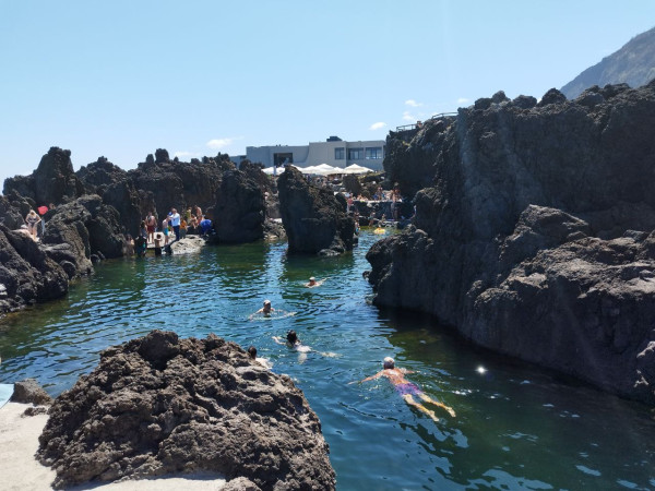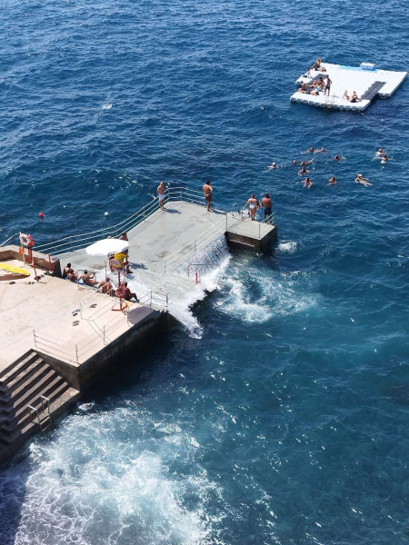 Поскольку в основном везде – вулканические скалы, обрывающиеся в море, пляжей на острове мало. Те, что были в черте г.Фуншал, представляли из себя бетонную плиту с отвесными поручнями, спускавшимися в пучину. Пучина даже без ветра все время пучится и беснуется.