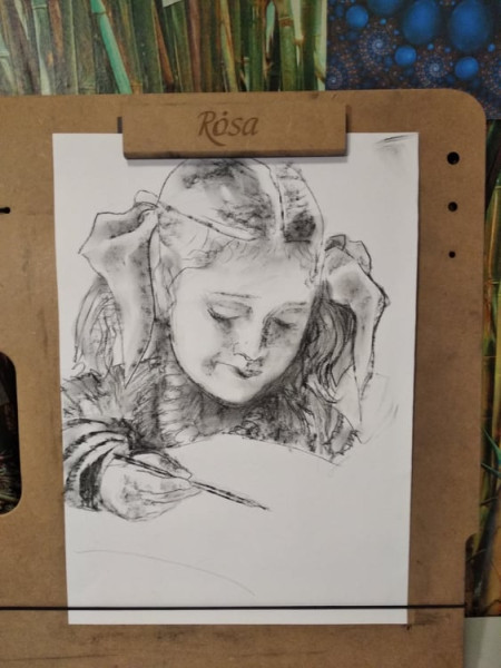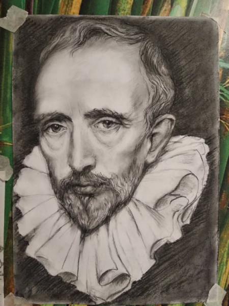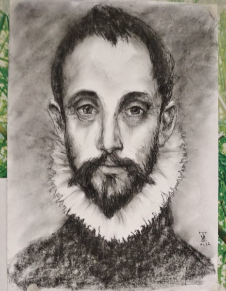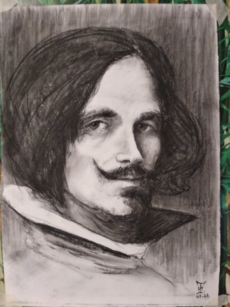 В ту неделю, когда требовалось его срисовать, у меня дико болели зубы. Я думала, что это тройничный нерв, пыталась как-то это дело утихомирить, долго мучилась, пока мой зуб мудрости не признался, что это он, и далее шутить и притворяться не намерен. А мне в тот день надо было сдавать домашку с мрачным Веласкесом. Ну я села и с огромным трудом наваяла. Получился портрет моей зубной боли и ненависти. Такой страшный, что я засунула его за шкаф, чтоб не видеть, и побежала драть зуб.