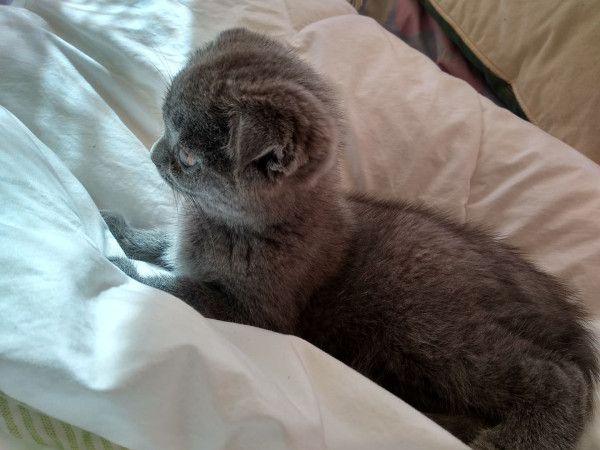 Все, не выдержала моя душа заточения и коронавирусной тоски. Завели себе котенка 8 апреля. Это шотландский вислоухий короткошерстный мальчик 2.5 мес. Имени нет, пока называем его просто Котя. Зато есть паспорт, прививки, порода, все дела. Приучен к гигиене, ласковый мурлыка. Невозможно сладкий. Я не только про тяготы карантина забыла, в первый день забыла даже умыться, потому что мимими начинается еще не открывши глаз. Получил имя Бродский. Погоняло - Плоско-бОшк и Ути-пути-сладенький-мимими. PPS Два года спустя, 11 апреля 2022 года - в самом расцвете творческого пути. <…>