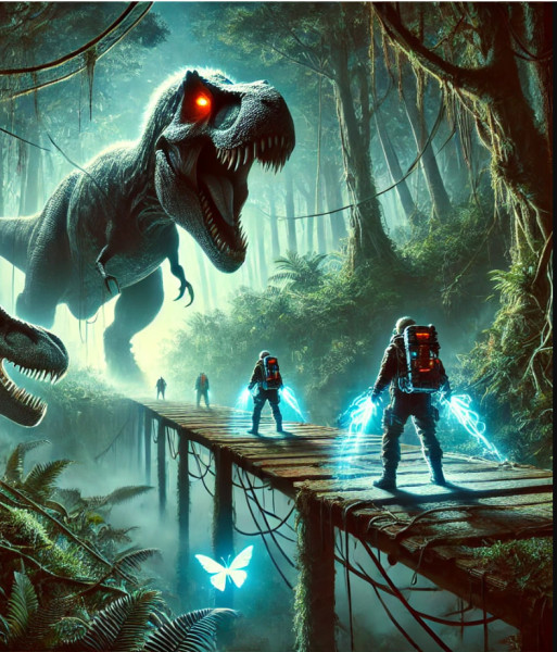 Сложу сюда, пусть зафиксируется заря новой эпохи. С помощью ChatGPT-4o cоздала картинку по рассказу Р.Бредбери "И грянул гром" (текстовый промпт - ниже): текст был: A towering Tyrannosaurus rex looms in the background, its teeth bared and eyes glowing with primal fury. The jungle is dense, with towering trees, ferns, and an otherworldly mist, giving the setting a surreal atmosphere. In the foreground, we see the terrified faces of the time-travelers in futuristic gear, stood at a wooden path which is lifted over the ground/ They are frozen in shock as they realize their mistake. <…>